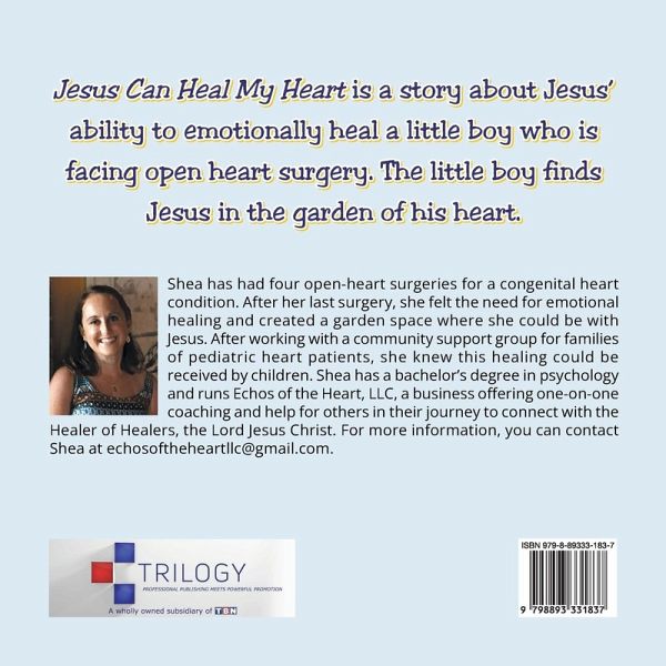 Jesus Can Heal My Heart is a story about Jesus' ability to emotionally heal a little boy who is facing open heart surgery. The little boy finds Jesus in the garden of his heart. Shea has had four open-heart surgeries for a congenital heart condition. After her last surgery, she felt the need for emotional healing and created a garden space where she could be with Jesus. After working with a community support group for families of pediatric heart patients, she knew this healing could be received by children. Shea has a bachelor's degree in psychology and runs Echos of the Heart, LLC, a business offering one-on-one coaching and help for others in their journey to connect with the Healers of Healers, the Lord Jesus Christ. For more information, you can contact Shea at echosoftheheartllc@gmail.com.