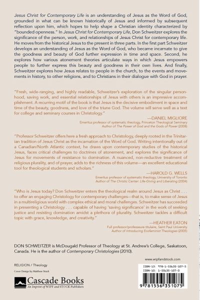 Jesus Christ for Contemporary Life is an understanding of Jesus as the Word of God, grounded in what can be known historically of Jesus and informed by subsequent reflection upon him, which hopes to help shape a Christian identity characterized by "bounded openness." In Jesus Christ for Contemporary Life, Don Schweitzer explores the significance of the person, work, and relationships of Jesus Christ for contemporary life. He moves from the historical Jesus to the present in three parts. In the first part Schweitzer develops an understanding of Jesus as the Word of God, who became incarnate to give the goodness and beauty of God further expression in time and space. Second, he explores how various atonement theories articulate ways in which Jesus empowers people to further express this beauty and goodness in their own lives. And finally, Schweitzer explores how Jesus relates to people in the church, to the events and movements in history, to other religions, and to Christians in their dialogue with God in prayer.
