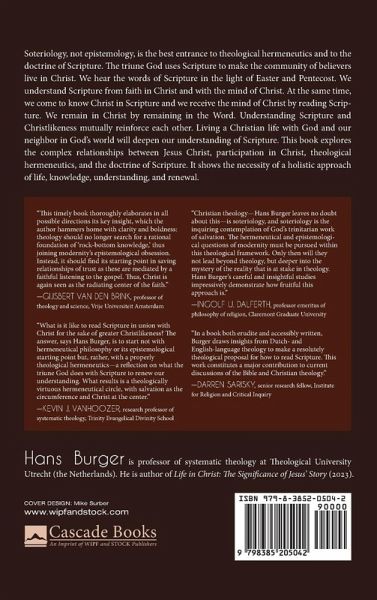 Soteriology, not epistemology, is the best entrance to theological hermeneutics and to the doctrine of Scripture. The triune God uses Scripture to make the community of believers live in Christ. We hear the words of Scripture in the light of Easter and Pentecost. We understand Scripture from faith in Christ and with the mind of Christ. At the same time, we come to know Christ in Scripture and we receive the mind of Christ by reading Scripture. We remain in Christ by remaining in the Word. Understanding Scripture and Christlikeness mutually reinforce each other. Living a Christian life with God and our neighbor in God's world will deepen our understanding of Scripture. This book explores the complex relationships between Jesus Christ, participation in Christ, theological hermeneutics, and the doctrine of Scripture. It shows the necessity of a holistic approach of life, knowledge, understanding, and renewal.