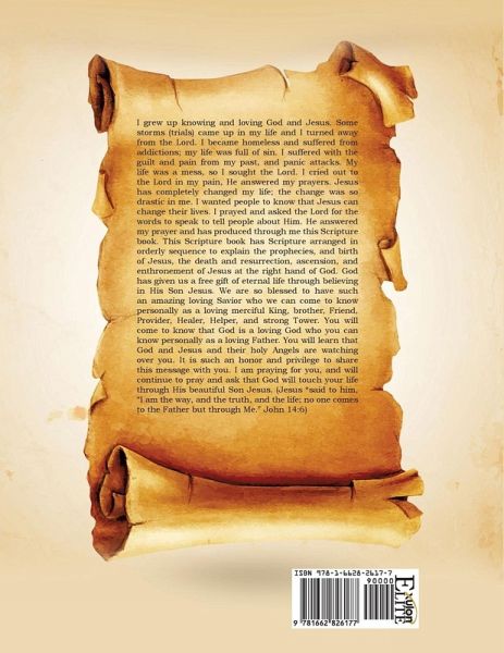 I grew up knowing and loving God and Jesus. Some storms (trials) came up in my life and I turned away from the Lord. I became homeless and suffered from addictions; my life was full of sin. I suffered with the guilt and pain from my past, and panic attacks. My life was a mess, so I sought the Lord. I cried out to the Lord in my pain, He answered my prayers. Jesus has completely changed my life; the change was so drastic in me. I wanted people to know that Jesus can change their lives. I prayed and asked the Lord for the words to speak to tell people about Him. He answered my prayer and has produced through me this Scripture book. This Scripture book has Scripture arranged in orderly sequence to explain the prophecies, and birth of Jesus, the death and resurrection, ascension, and enthronement of Jesus at the right hand of God. God has given us a free gift of eternal life through believing in His Son Jesus. We are so blessed to have such an amazing loving Savior who we can come to know personally as a loving merciful King, brother, Friend, Provider, Healer, Helper, and strong Tower. You will come to know that God is a loving God who you can know personally as a loving Father. You will learn that God and Jesus and their holy Angels are watching over you. It is such an honor and privilege to share this message with you. I am praying for you, and will continue to pray and ask that God will touch your life through His beautiful Son Jesus. (Jesus *said to him, "I am the way, and the truth, and the life; no one comes to the Father but through Me." John 14:6)
