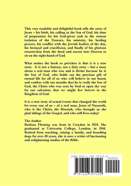 This readable and delightful book tells the story of Jesus - his birth, his calling as the Son of God, his time of preparation for his God-given task in the remote isolation of the Essenes, his ministry, his healing powers, his conflict with the Jewish leaders of the day, his betrayal and crucifixion, and finally of his glorious resurrection from the dead and ascent into Heaven to sit on the right-hand of God. It is a true story of actual events that changed the world for every one of us - of a real man, Jesus of Nazareth, who is the Christ, the Messiah, who brought us the glad tidings of the Gospel, and who still lives today! The Author Barbara Fleming was born in Croydon in 1924. She graduated at University College, London, in 1944. Retired from teaching, raising a family, and boarding dogs for over 40 years, she is now a writer of fascinating and enlightening studies of the Bible.