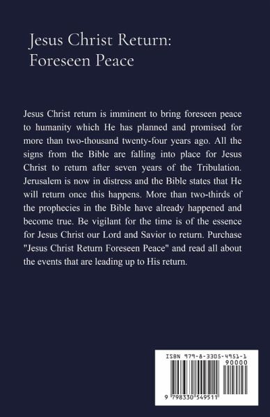 Be vigilant for the time is of the essence for Jesus Christ our Lord and Savior to return. Purchase "Jesus Christ Return Foreseen Peace" and read all about the events that are leading up to His return.