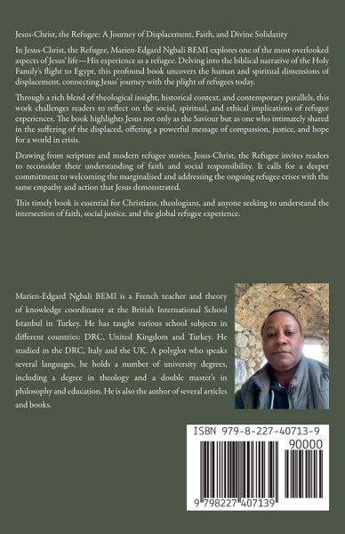 Jesus-Christ, the Refugee: A Journey of Displacement, Faith, and Divine Solidarity In Jesus-Christ, the Refugee, Marien-Edgard Ngbali BEMI explores one of the most overlooked aspects of Jesus' life-His experience as a refugee. Delving into the biblical narrative of the Holy Family's flight to Egypt, this profound book uncovers the human and spiritual dimensions of displacement, connecting Jesus' journey with the plight of refugees today. Through a rich blend of theological insight, historical context, and contemporary parallels, this work challenges readers to reflect on the social, spiritual, and ethical implications of refugee experiences. The book highlights Jesus not only as the Saviour but as one who intimately shared in the suffering of the displaced, offering a powerful message of compassion, justice, and hope for a world in crisis. Drawing from scripture and modern refugee stories, Jesus-Christ, the Refugee invites readers to reconsider their understanding of faith and social responsibility. It calls for a deeper commitment to welcoming the marginalised and addressing the ongoing refugee crises with the same empathy and action that Jesus demonstrated. This timely book is essential for Christians, theologians, and anyone seeking to understand the intersection of faith, social justice, and the global refugee experience.