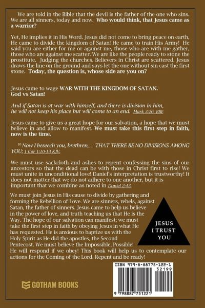 The Bible teaches us that Satan is the father of sinners. We are all sinners, here and now. Surprisingly, Jesus Christ came as a warrior to gather those who are FOR HIM. These are the rebels who will join Him in His cause to divide the kingdom of Satan. He did not come to bring peace on earth, but rather to divide, and to teach us a more excellent way through unconditional love. He came to equip and train His army. He came to inform the Churches that there should be no division among them and make us aware of who we are and what we need to do. This rebellion will be a "rebellion of love" and all believers must GATHER! Jesus Christ the Warrior is Our Victor as He has promised! He left instructions, who, what, where, when, and why! He came to offer us the opportunity and hope in our salvation and transformation. Through our transformation we will become immortals of love and incorruption. We must take the first step in faith and follow His instructions. Supported by scripture, we seek to find answers and they are here. Who will be part of the finale? Choose your master!