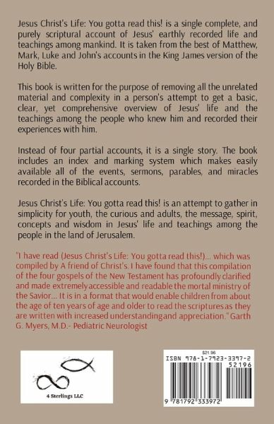 Jesus Christ's Life: You gotta read this! is the perfect introduction to Jesus Christ for children, teens, adults and even new comers to Christianity! It is a single, complete, and purely scriptural account of Jesus' earthly recorded life and teachings among mankind. It is taken from the best of Matthew, Mark, Luke and John's accounts in the King James Version of the Holy Bible. Instead of four partial accounts, this is a single story, easy enough for a 10 year old to read and includes over 30 artist's renditions of these Biblical stories. The book makes easily available all of the events, sermons, parables, and miracles recorded in the Biblical accounts. This book is written for the purpose of removing all the unrelated material and complexity in a person's attempt to get a basic, clear, yet comprehensive overview of Jesus' life and teachings among the people who knew him, and recorded their experiences with him. Jesus Christ's Life: You gotta read this! is an attempt to gather in simplicity for youth, adults and even those just interested in Christianity, the message, spirit, concepts and wisdom in Jesus' life and teachings among the people in the land of Jerusalem.
