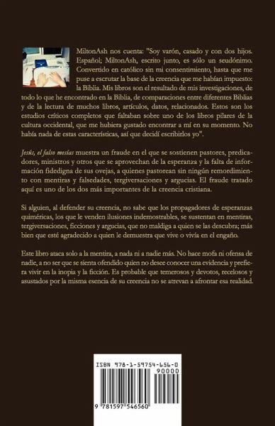 Muestra un fraude en el que se sostienen pastores, predicadores, ministros y otros que se aprovechan de la esperanza y la falta de informacion fidedigna de sus ovejas, a quienes pastorean sin ningún remordimiento con mentiras y falsedades, tergiversaciones y argucias. El fraude tratado aqui es uno de los dos más importantes de la creencia cristiana. Puede ver mas informacion en http://www.librosenred.com/libros/jesuselfalsomesias.html. [Este texto fue escrito sin tildes ni otros caracteres especiales para evitar errores con el navegador.]