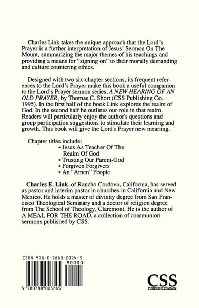 Charles Link takes the unique approach that the Lord's Prayer is a further interpretation of Jesus' Sermon On The Mount, summarizing the major themes of his teachings and providing a means for "signing on" to their morally demanding and culture countering ethics. Designed with two six-chapter sections, its frequent references to the Lord's Prayer make this book a useful companion to the Lord's Prayer sermon series, A New Hearing Of An Old Prayer, by Thomas C. Short (CSS Publishing Co. 1995). In the first half of the book Link explores the realm of God. In the second half he outlines our role in that realm. Readers will particularly enjoy the author's questions and group participation suggestions to stimulate their learning and growth. This book will give the Lord's Prayer new meaning. Chapter titles include: • Jesus As Teacher Of The Realm Of God • Trusting Our Parent-God • Forgiven Forgivers • An "Amen" People Charles E. Link, of Rancho Cordova, California, has served as pastor and interim pastor in churches in California and New Mexico. He holds a master of divinity degree from San Francisco Theological Seminary and a doctor of religion degree from The School of Theology, Claremont. He is the author of A Meal For The Road, a collection of communion sermons published by CSS.