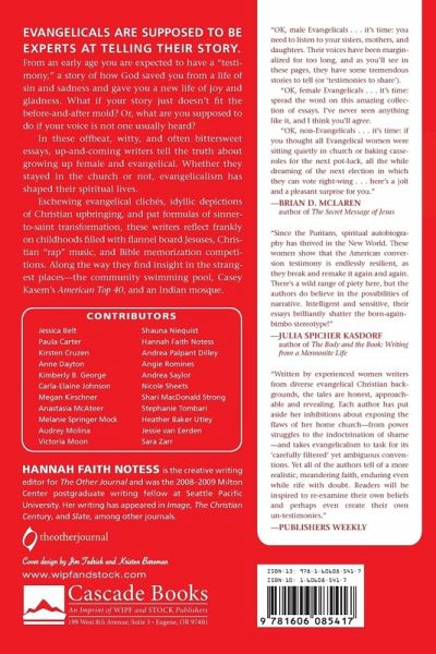 Evangelicals are supposed to be experts at telling their story. From an early age you are expected to have a ""testimony,"" a story of how God saved you from a life of sin and sadness and gave you a new life of joy and gladness. What happens if you don't have such a testimony? What if your story just doesn't fit the before-and-after mold? What are you supposed to do if your voice is not one usually heard? In these offbeat, witty, and often bittersweet essays, up-and-coming writers tell the truth about growing up female and evangelical. Whether they stayed in the church or not, evangelicalism has shaped their spiritual lives. Eschewing evangelical cliches, idyllic depictions of Christian upbringing, and pat formulas of sinner-to-saint transformation, these writers reflect frankly on childhoods filled with flannel board Jesuses, Christian ""rap"" music, and Bible memorization competitions. Along the way they find insight in the strangest places--the community swimming pool, Casey Kasem's American Top 40, and an Indian mosque. Together this collection of essays provides a vivid and diverse portrait of life in the evangelical church, warts and all. List of Contributors: Jessica Belt Paula Carter Kirsten Cruzen Anne Dayton Kimberly B. George Carla-Elaine Johnson Megan Kirschner Anastasia McAteer Melanie Springer Mock Audrey Molina Victoria Moon Shauna Niequist Hannah Faith Notess Andrea Palpant Dilley Angie Romines Andrea Saylor Nicole Sheets Shari MacDonald Strong Stephanie Tombari Heather Baker Utley Jessie van Eerden Sara Zarr