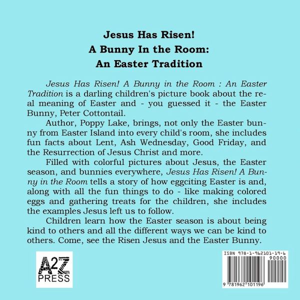 Jesus Has Risen! A Bunny in the Room : An Easter Tradition is a darling children's picture book about the real meaning of Easter and - you guessed it - the Easter Bunny, Peter Cottontail. Author, Poppy Lake, brings, not only the Easter bunny from Easter Island into every child's room, she includes fun facts about Lent, Ash Wednesday, Good Friday, and the Resurrection of Jesus Christ and more. Filled with colorful pictures about Jesus, the Easter season, and bunnies everywhere, Jesus Has Risen! A Bunny in the Room tells a story of how eggciting Easter is and, along with all the fun things to do - like making colored eggs and gathering treats for the children, she includes the examples Jesus left us to follow. Children learn how the Easter season is about being kind to others and all the different ways we can be kind to others. Come, see the Risen Jesus and the Easter Bunny.