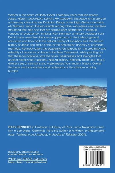 Written in the genre of Henry David Thoreau's travel-thinking essays, Jesus, History, and Mount Darwin: An Academic Excursion is the story of a three-day climb into the Evolution Range of the High Sierra mountains of California. Mount Darwin stands among other mountains near fourteen thousand feet high and that are named after promoters of religious versions of evolutionary thinking. Rick Kennedy, a history professor from Point Loma, uses the climb as an opportunity to think about general education and how both the natural history of evolution and the ancient history of Jesus can find a home in the Aristotelian diversity of university methods. Kennedy offers the academic foundations for the credibility and reliability of accounts of Jesus in the New Testament, while pointing out that these foundations have the same weaknesses and strengths that ancient history has in general. Natural history, Kennedy points out, has a different set of strengths and weaknesses from ancient history. Overall, the book reminds students and professors of the wisdom in being humble.