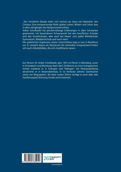 Der christliche Glaube dreht sich zentral um Jesus von Nazareth, den Christus. Eine entsprechende Rolle spielt Leben, Wirken und Lehre Jesu in allen Jahrgängen des Religionsunterrichtes. Volker Schoßwald hat jahrzehntelange Erfahrungen in allen Schularten gesammelt, mit besonderem Schwerpunkt bei den beruflichen Schulen und den Grundschulen, aber auch bei Haupt- und später Mittelschule, Gymnasium Walddorfschule und noch mehr. Die praktischen Ergebnisse seines Unterrichtens legt er nun in Buchform vor. Er versteht dieses als Steinbruch für Lehrkräfte. Entsprechend finden sich auch Arbeitsblätter, die sich modifizieren lassen. Zur Person: Dr. Volker Schoßwald, geb. 1955 ist Pfarrer in Nürnberg, zuvor in Schwabach und Würzburg. Nach dem Zivildienst an einer evangelischen Schule studierte er in Erlangen und Tübingen, die Vikarsausbildung absolvierte er in Neuensdettelsau. Er ist Verfasser etlicher Sachbücher sowie von Biographien. Als Vater zweier Söhne verfügt er auch über den Familienaspekt Richtung Schule und Unterricht.