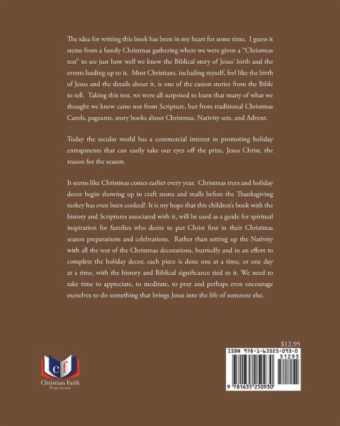 The idea for writing this book has been in my heart for some time. I guess it stems from a family Christmas gathering where we were given a "Christmas test" to see just how well we knew the Biblical story of Jesus' birth and the events leading up to it. Most Christians, including myself, feel like the birth of Jesus and the details about it, is one of the easiest stories from the Bible to tell. Taking this test, we were all surprised to learn that many of what we thought we knew came not from Scripture, but from traditional Christmas Carols, pageants, story books about Christmas, Nativity sets, and Advent. Today the secular world has a commercial interest in promoting holiday entrapments that can easily take our eyes off the prize, Jesus Christ, the reason for the season. It seems like Christmas comes earlier every year. Christmas trees and holiday decor begin showing up in craft stores and malls before the Thanksgiving turkey has even been cooked! It is my hope that this children's book with the history and Scriptures associated with it, will be used as a guide for spiritual inspiration for families who desire to put Christ first in their Christmas season preparations and celebrations. Rather than setting up the Nativity with all the rest of the Christmas decorations, hurriedly and in an effort to complete the holiday decor, each piece is done one at a time, or one day at a time, with the history and Biblical significance tied to it. We need to take time to appreciate, to meditate, to pray and perhaps even encourage ourselves to do something that brings Jesus into the life of someone else.