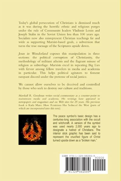 The cover depicts a crucifix upside down with a peace symbol overlay. The basic "peace symbol" design has a long association with Satanic rituals and witchcraft. As an atheist-based ideology, Communist operatives in the 1950s made today's peace symbol popular. Socialist operatives now misrepresent Christian teachings (about love and peace in particular) as a covert means of achieving Marxist-based political goals. This subversion turns the true message of the Scriptures upside down. This book exposes the political corruption of Christianity, militant atheists and methods, and the use of religion as subterfuge. "Every person who cherishes freedom will find this book of great interest ..." "Recommend it highly as an easy read on a difficult topic ..." "Inspired writing that parts the dark clouds and lets the truth shine in ..." "Goodman exposes socialist policies aimed at abolishing religion and family ..."