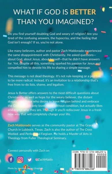 What if God Is Better Than You Imagined? Do you find yourself doubting God and weary of religion? Are you tired of the confusing answers, the hypocrisy, and the feeling that God isn't enough? If so, you're not alone. Like many believers, author and pastor Zach Maldonado experienced the same disappointment with Christianity. He asked questions-about God, about Jesus, about himself-that he didn't have answers for. Yet, despite all this, something sparked his passion for Jesus and compelled him to devote his life to sharing a simple message. This message is not dead theology. It's not rule-keeping or a pep talk to be more radical. Instead, it's an invitation to a relationship that's free from to-do lists, shame, and legalism. Jesus Is Better offers answers to the most difficult questions about Christianity, as well as hope for the weary believer, the distant skeptic, and those who desire to leave religion behind and embrace the God who not only loves them without condition, but actually likes and enjoys who they are. Through it you'll rediscover Jesus in a fresh new way that will completely change your life.