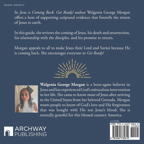 In Jesus is Coming Back. Get Ready! author Walgenia George Morgan offers a host of supporting scriptural evidence that foretells the return of Jesus to earth. In this guide, she reviews the coming of Jesus, his death and resurrection, his relationship with the disciples, and his promise to return. Morgan appeals to all to make Jesus their Lord and Savior because He is coming back. She encourages everyone to Get Ready!