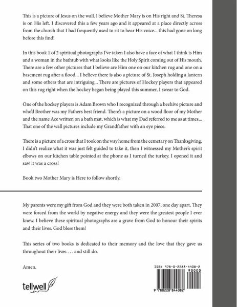 This is a picture of Jesus on the wall.l believe Mother Mary is on His right and St.Theresa is on His left. I discovered this a few years ago and it appeared at a place directly across from the church that I had frequently used to sit to hear His voice...this had gone on long before this find! In this book 1 of 2 spiritual photographs I've taken I also have a face of what I think is Him and a woman in the bathtub with what looks like the Holy Spirit coming out of His mouth. There are a few other pictures that I believe are Him one on our kitchen rug and one on a basement rug after a flood...I believe there is also a picture of St.Joseph holding a lantern and some others that are intriguing...There are pictures of Hockey players that appeared on this rug right when the hockey began being played this summer, I swear to God. One of the hockey players is Adam Brown who I recognized through a beehive picture and who'd Brother was my Fathers best friend.There's a picture on a wood floor of my Mother and the name Ace written on a bath mat, which is what my Dad referred to me as at times... There is a picture of a cross that I took on the way home from the cemetary on Thanksgiving, I didn't realize what it was just felt guided to take it, then I witnessed my Mother's spirit elbows on our kitchen table pointed at the phone as I turned the turkey. I opened it and saw it was a cross! Book two Mother Mary is Here to follow shortly.