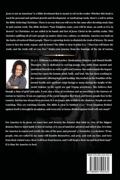 Jesus is not an American is a Bible Devotional that is meant to stir action in the reader. Whether this book is used for personal and spiritual growth and development, or small group study, there is a call to action for Bible-believing Christians. There is no way that you will ever be the same after devoting study time to abolishing anti-Black racism. The Bible declares "your Kingdom come, your will be done, on earth as it is in heaven." As Christians, we are called to be the hands and feet of Jesus Christ in the earth realm. This includes uplifting all of God's people no matter their race, culture or ethnicity. America was built on the backs of enslaved Black people. There is a growing desire to diminish the truth of History. We must learn to face the truth, repent, and do better! The Bible is clear in John 8:32 "Then you will know the truth, and the truth will set you free."