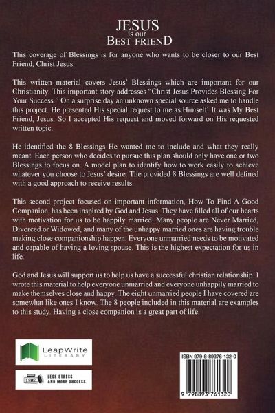 This coverage of Blessings is for anyone who wants to be closer to our Best Friend, Christ Jesus. This written material covers Jesus' Blessings which are important for our Christianity. This important story addresses "Christ Jesus Provides Blessing For Your Success." On a surprise day an unknown special source asked me to handle this project. He presented His special request to me as Himself. It was My Best Friend, Jesus. So I accepted His request and moved forward on His requested written topic. He identified the 8 Blessings He wanted me to include and what they really meant. Each person who decides to pursue this plan should only have one or two Blessings to focus on. A model plan to identify how to work easily to achieve whatever you choose to Jesus' desire. The provided 8 Blessings are well defined with a good approach to receive results. This second project focused on important information, How To Find A Good Companion, has been inspired by God and Jesus. They have filled all of our hearts with motivation for us to be happily married. Many people are Never Married, Divorced or Widowed, and many of the unhappy married ones are having trouble making close companionship happen. Everyone unmarried needs to be motivated and capable of having a loving spouse. This is the highest expectation for us in life. God and Jesus will support us to help us have a successful Christian relationship. I wrote this material to help everyone unmarried and everyone unhappily married to make themselves close and happy. The eight unmarried people I have covered are somewhat like ones I know. The 8 people included in this material are examples to this study. Having a close companion is a great part of life.