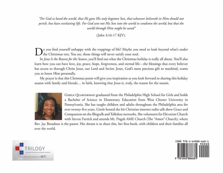 Do you find yourself unhappy with the trappings of life? Maybe you need to look beyond what's under the Christmas tree. You see, those things will never satisfy your soul. In Jesus Is the Reason for the Season, you'll find out what the Christmas holiday is really all about. You'll also learn how you can have love, joy, peace, hope, forgiveness, and eternal life-the blessings that every believer has access to through Christ Jesus, our Lord and Savior. Jesus, God's most precious gift to mankind, wants you to know Him personally. My prayer is that this Christmas poem will give you inspiration as you look forward to sharing this holiday season with family and friends... in faith, knowing that Jesus is, truly, the reason for the season.