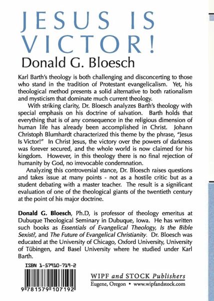 Karl Barth's theology is both challenging and disconcerting to those who stand in the tradition of Protestant evangelicalism. Yet his theological method presents a solid alternative to both rationalism and mysticism that dominate much current theology. With striking clarity, Dr. Bloesch analyzes Barth's theology with special emphasis on his doctrine of salvation. Barth holds that everything that is of any consequence in the religious dimension of human life has already been accomplished in Christ. Johann Christoph Blumhardt characterized this theme by the phrase, ""Jesus Is Victor!"" In Christ Jesus, the victory over the powers of darkness was forever secured, and the whole world is now claimed for his kingdom. In this theology there is no final rejection of humanity by God, no irrevocable condemnation. Analyzing this controversial stance, Dr. Bloesch raises questions and takes issue at many points - not as a hostile critic but as a student debating with a master teacher. The result is a significant evaluation of one of the theological giants of the twentieth century at the point of his major doctrine.