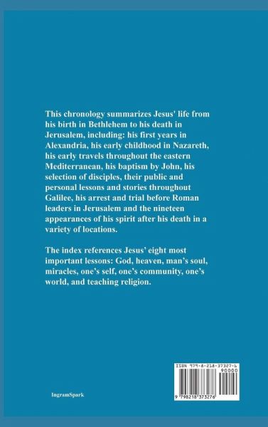 Jesus' Life: The chronology summarizes Jesus' life from his birth in Bethlehem to his death in Jerusalem, including his first years in Alexandria, his early childhood in Nazareth, his father's death, his early travels throughout the eastern Mediterranean, his baptism by John, his selection of disciples, his lessons and stories told throughout Galilee, his arrest and trial before Roman leaders in Jerusalem and the nineteen appearances of his spirit in a variety of locations after his death. Jesus' Lessons: The index references Jesus' lessons and stories in eight categories: God, heaven, man's soul, miracles, one's self, one's community, one's world, and teaching.