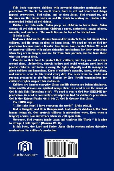 Jesus Loves Children Vol. II ID 25360. Information for the cover. This book empowers children with powerful defensive mechanisms for protection when they are in danger. We live in the world where there is evil and where bad things happen everywhere. God exists, so does Satan. God created us, and He loves us. Satan hates us and He wants to destroy us. Satan is the mastermind behind all evil doing. Children are vulnerable; Satan preys upon children to harm them. Satan causes all evil doing including: Children's rapes, abductions, sexual abuses, assaults, and murders. The world lies on the lap of the wicked one: 19We know that we are children of God, and that the whole world is under the control of the evil one [I John 5:19]. Satan wants to destroy us. But God Our Creator loves us and protects us. God loves children; He blesses them and He protects them. But Satan hates children, and He Preys upon them to harm. God is greater than Satan. God loves children and He protects them. We need to run to God for protection. We need to empower children with unique defensive mechanisms for protection when they are in danger, far from their parents, and far from those who can protect them. Most parents do their best to protect their children; but, they are not always around their children to protect them. Authorities, school administrators, church leaders and professionals of social institutions for children's protection do their best to protect children, but Satan fights diligently and still manages to allure children and harm them. Satan is an evil spiritual being, He follows children even in their homes to cause the tragedies of rape, sexually abuse, assault, and murder. Cases of children's assaults, rapes, abductions, and murders occur in this world frequently. The news from the media and reports of complaints presented to the United Nations by Non - Profit organizations which advocate for children's rights attest to this statement. The harm against