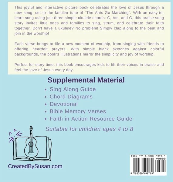 This joyful and interactive picture book celebrates the love of Jesus through a new song, set to the familiar tune of "The Ants Go Marching". With an easy-to-learn song using just three simple ukulele chords: C, Am, and G, this praise song story makes it fun for little ones and families to sing along and celebrate their faith. Each verse brings to life a new moment of worship, from singing with friends to offering heartfelt prayers. With simple black sketches against colorful backgrounds, the book's illustrations mirror the simplicity and joy of worship. Perfect for story time, this book encourages kids to lift their voices in praise and feel the love of Jesus every day. The book also includes helpful supplemental material and offers additional faith-based activities. Supplemental material includes a Sing Along Guide, Chord Diagrams, Devotional, Bible Memory Verses, and the Faith in Action Resource Guide.