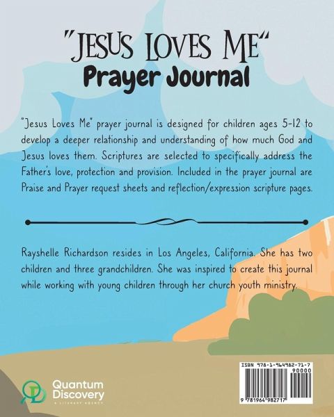 "Jesus Loves Me" prayer journal is designed for children ages 5-12 to develop a deeper relationship and understanding of how much God and Jesus loves them. Scriptures are selected to specifically address the Father's love, protection and provision. Included in the prayer journal are Praise and Prayer request sheets and reflection/expression scripture pages. Rayshelle Richardson resides in Los Angeles, California. She has two children and three grandchildren. She was inspired to create this journal while working with young children through her church youth ministry.