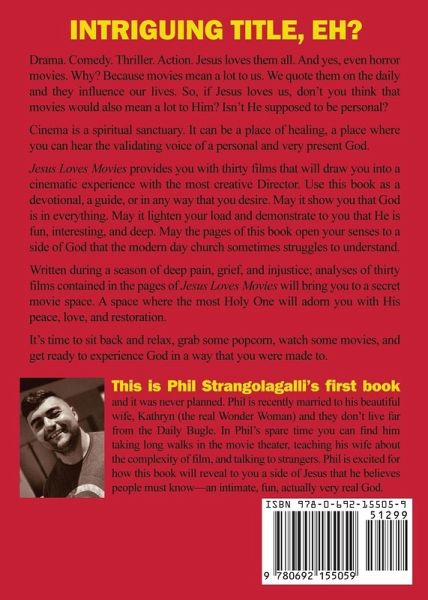 Intriguing title, eh? Drama. Comedy. Thriller. Action. Jesus loves them all. And yes, even horror movies. Why? Because movies mean a lot to us. We quote them on the daily and they influence our lives. So, if Jesus loves us, don't you think that movies would also mean a lot to Him? Isn't He supposed to be personal? Cinema is a spiritual sanctuary. It can be a place of healing, a place where you can hear the validating voice of a personal and very present God. Jesus Loves Movies provides you with thirty films that will draw you into a cinematic experience with the most creative Director. Use this book as a devotional, a guide, or in any way that you desire. May it show you that God is in everything. May it lighten your load and demonstrate to you that He is fun, interesting, and deep. May the pages of this book open your senses to a side of God that the modern day church sometimes struggles to understand. Written during a season of deep pain, grief, and injustice; analyses of thirty films contained in the pages of Jesus Loves Movies will bring you to a secret movie space. A space where the most Holy One will adorn you with His peace, love, and restoration. It's time to sit back and relax, grab some popcorn, watch some movies, and get ready to experience God in a way that you were made to. This is Phil Strangolagalli's first book and it was never planned. Phil is recently married to his beautiful wife, Kathryn (the real Wonder Woman) and they don't live far from the Daily Bugle. In Phil's spare time you can find him taking long walks in the movie theater, teaching his wife about the complexity of film, and talking to strangers. Phil is excited for how this book will reveal to you a side of Jesus that he believes people must know-an intimate, fun, actually very real God.