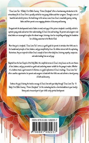 Jesus Loves You - A Baby's First Bible Journey - Picture Storybook - Helping Children Learn About The Love Of Jesus As They Follow His Example. "Jesus Loves You - A Baby's First Bible Journey - Picture Storybook" offers a heartwarming introduction to the extraordinary life of Jesus Christ, specially crafted for very young children and their caregivers. Through a series of beautiful and colorful pictures, this book brings to life various scenes from Jesus's remarkable journey, inviting babies and their parents on an engaging adventure of discovery and learning. Designed with the developmental needs of babies in mind, each page of this picture storybook is carefully crafted to captivate young minds and nurture their understanding of Jesus's love and teachings. As parents and caregivers read aloud, babies are encouraged to explore the vibrant images, fostering a love for storytelling and laying the foundation for a lifelong connection to the Word of God. More than just a storybook, "Jesus Loves You" serves as a gentle guide for parents to introduce their little ones to the foundational principles of love, kindness, and joy exemplified by Jesus. As children interact with the captivating illustrations, they are inspired to follow Jesus's example of love in their daily lives, fostering empathy, compassion, and understanding from an early age. Adapted from the four Gospels of the Holy Bible, this simplified version of Jesus's story focuses on the core themes of love, kindness, and joy, presented in a gentle and comforting manner suitable for the youngest readers. Whether it's a bedtime ritual, a quiet moment of reflection, or a joyful exploration of Jesus's teachings, "Jesus Loves You" offers countless opportunities for parents and caregivers to bond with their little ones and cultivate a shared journey of faith and discovery. Embrace the joy of sharing the timeless message of Jesus's love with your baby through "Jesus Loves You - A Baby's First Bible Journey - Pictur