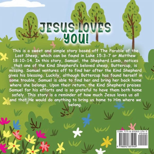 A Lost Sheep, a Brave Friend, and a Journey Back Home-Discover the Depth of Love in This Heartwarming Tale! When Buttercup, one of the Kind Shepherd's cherished sheep, goes missing, it's up to Samuel the Shepherd Lamb to bring her back. With the Shepherd's blessing, Samuel sets off on an adventure filled with hope, courage, and a few unexpected challenges along the way. Will Samuel find Buttercup and bring her safely home? Inspired by the timeless Parable of the Lost Sheep (Luke 15:3-7 and Matthew 18:10-14), "Jesus Loves You!" Says Samuel the Shepherd Lamb beautifully illustrates the boundless love that seeks out the lost and rejoices in their return. This enchanting story reminds us all that no matter how far we wander, there's always a path back home. Perfect for bedtime reading and family moments, this book is a touching way to share the message of unconditional love with your little ones. Bring this inspiring story into your home-order your copy today and let your child's heart be touched by the joy of coming home.