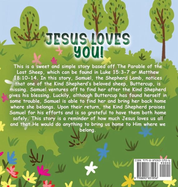A Lost Sheep, a Brave Friend, and a Journey Back Home-Discover the Depth of Love in This Heartwarming Tale! When Buttercup, one of the Kind Shepherd's cherished sheep, goes missing, it's up to Samuel the Shepherd Lamb to bring her back. With the Shepherd's blessing, Samuel sets off on an adventure filled with hope, courage, and a few unexpected challenges along the way. Will Samuel find Buttercup and bring her safely home? Inspired by the timeless Parable of the Lost Sheep (Luke 15:3-7 and Matthew 18:10-14), "Jesus Loves You!" Says Samuel the Shepherd Lamb beautifully illustrates the boundless love that seeks out the lost and rejoices in their return. This enchanting story reminds us all that no matter how far we wander, there's always a path back home. Perfect for bedtime reading and family moments, this book is a touching way to share the message of unconditional love with your little ones. Bring this inspiring story into your home-order your copy today and let your child's heart be touched by the joy of coming home.