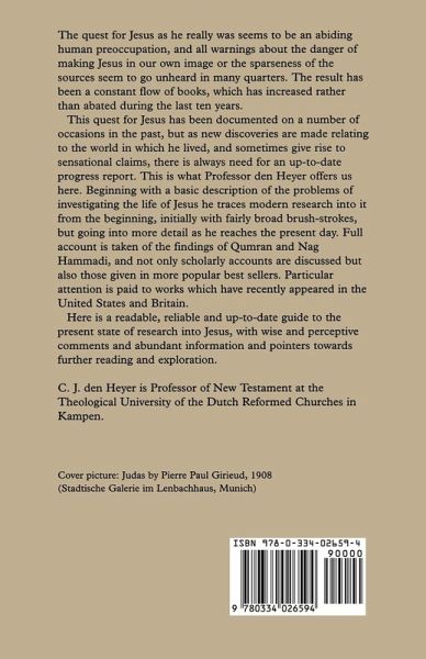 he quest for Jesus as he really was seems to be an abiding human preoccupation, and all warnings about the danger of making Jesus in our own image or the sparseness of the sources seem to go unheard in many quarters. The result has been a constant flow of books, which has increased rather than abated during the last ten years. This quest for Jesus has been documented on a number of occasions in the past, but as new discoveries are made relating to the world in which he lived, and sometimes give rise to sensational claims, there is always need for an up-to-date progress report. This is what Professor den Heyer offers us here. Beginning with a basic description of the problems of investigating the life of Jesus he traces modern research into it from the beginning, initially with fairly broad brush-strokes, but going into more detail as he reaches the present day. Full account is taken of the findings of Qumran and Nag Hammadi, and not only scholarly accounts are discussed but also those given in more popular best sellers. Particular attention is paid to works which have recently appeared in the United States and Britain. Here is a readable, reliable and up-to-date guide to the present state of research into Jesus, with wise and perceptive comments and abundant information and pointers towards further reading and exploration.