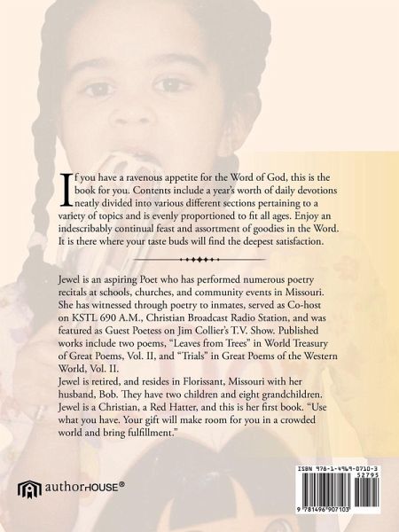 If you have a ravenous appetite for the Word of God, this is the book for you. Contents include a year's worth of daily devotions neatly divided into various different sections pertaining to a variety of topics and is evenly proportioned to fit all ages. Enjoy an indescribably continual feast and assortment of goodies in the Word. It is there where your taste buds will find the deepest satisfaction.