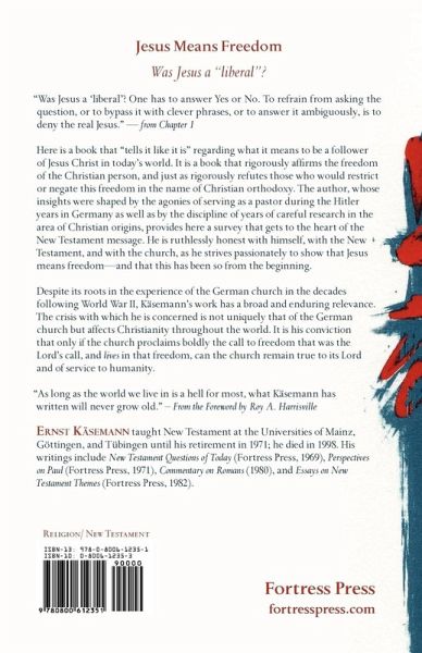 Here is a book that "tells it like it is" regarding what it means to be a follower of Jesus Christ in today's world. It is a book that rigorously affirms the freedom of the Christian person, and just as rigorously refutes those who would restrict or negate this freedom in the name of Christian orthodoxy. The author, whose insights were shaped by the agonies of serving as a pastor during the Hitler years in Germany as well as by the discipline of years of careful research in the area of Christian origins, provides here a survey that gets to the heart of the New Testament message. He is ruthlessly honest with himself, with the New Testament, and with the church, as he strives passionately to show that Jesus means freedom - and that this has been so from the beginning. Despite its roots in the experience of the German church in the decades following World War II, Ksemann's work has a broad and enduring relevance. The crisis with which he is concerned is not uniquely that of the German church but affects Christianity throughout the world. It is his conviction that only if the church proclaims boldly the call to freedom that was the Lord's call, and lives in that freedom, can the church remain true to its Lord and of service to humanity.