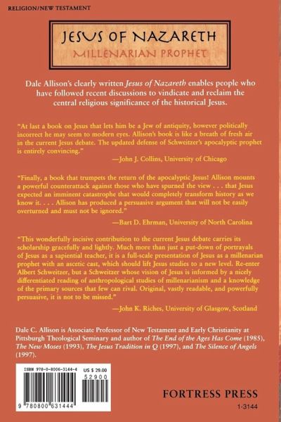 Dale Allison's clearly written Jesus of Nazareth will enable people who have followed recent discussions to vindicate and reclaim the central religious significance of the historical Jesus. Allison makes a creative contribution to Jesus studies in several ways: He offers new suggestions for establishing the authenticity of Jesus' word - including what he calls "the index of intertextual linkage" - and for the process of framing a convincing picture of the central thrust and purpose of the activity of Jesus. Referring to fascinating cross-cultural millenarian parallels, he shows that the impetus for the pre-Easter Jesus movement was apocalyptic in nature and that the historical Jesus can best be understood as an eschatological prophet. He presents the first full-length treatment of the question of Jesus and asceticism and shows that Jesus, far from the image suggested by some today, was driven by an apocalyptic asceticism that extended to matters of sex, food, and social relations. Always evenhanded and fair, Allison's new work is nonetheless penetrating, acute, and provocative.