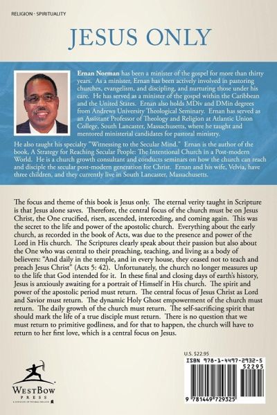 The focus and theme of this book is Jesus only. The eternal verity taught in Scripture is that Jesus alone saves. Therefore, the central focus of the church must be on Jesus Christ, the One crucified, risen, ascended, interceding, and coming again. This was the secret to the life and power of the apostolic church. Everything about the early church, as recorded in the book of Acts, was due to the presence and power of the Lord in His church. The Scriptures clearly speak about their passion but also about the One who was central to their preaching, teaching, and living as a body of believers: "And daily in the temple, and in every house, they ceased not to teach and peach Jesus Christ" (Acts 5: 42). Unfortunately, the church no longer measures up to the life that God intended for it. In these final and closing days of earth's history, Jesus is anxiously awaiting for a portrait of Himself in His church. The spirit and power of the apostolic period must return. The central focus of Jesus Christ as Lord and Savior must return. The dynamic Holy Ghost empowerment of the church must return. The daily growth of the church must return. The self-sacrificing spirit that should mark the life of a true disciple must return. There is no question that we must return to primitive godliness, and for that to happen, the church will have to return to her first love, which is a central focus on Jesus.