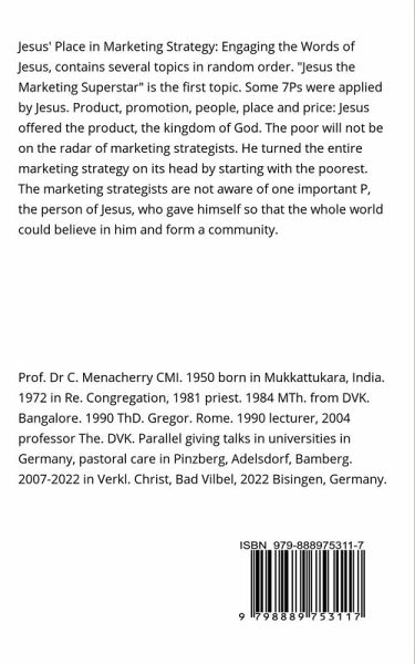 Jesus' Place in Marketing Strategy: Engaging the Words of Jesus, contains several topics in random order. "Jesus the Marketing Superstar" is the first topic. One in three people in the world is a follower of Jesus. Some 7Ps were applied by Jesus. Product, promotion, people, place and price: Jesus offered the product, the kingdom of God, to people at a very high price. Jesus knew the place where people were in need. The poor will not be on the radar of marketing strategists. Here lies the stark contrast to Jesus' strategy. He turned the entire marketing strategy on its head. Jesus' marketing strategy starts with the poorest. Although there are 7 P's, the marketing strategists are not aware of one important P, the person of Jesus, who gave himself so that the whole world could believe in him and form a community. The old Roman marketing principle of bread and circus was only superficial. Yes, Jesus fed the hungry, but he knew the basic spiritual needs of the people that they were not aware of. Here Jesus is telling the marketing strategists to keep in mind not only the material but also the basic spiritual needs of the people and to include this principle in their marketing strategy.