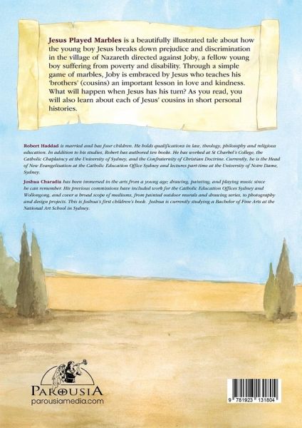 Jesus Played Marbles is a beautifully illustrated tale about how the young boy Jesus breaks down prejudice and discrimination in the village of Nazareth directed against Joby, a fellow young boy suffering from poverty and disability. Through a simple game of marbles, Joby is embraced by Jesus who teaches his 'brothers' (cousins) an important lesson in love and kindness. What will happen when Jesus has his turn? As you read, you will also learn about each of Jesus' cousins in short personal histories.