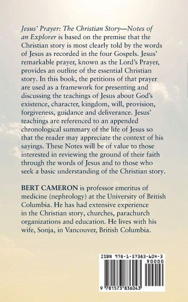 Jesus' Prayer: The Christian Story-Notes of an Explorer is based on the premise that the Christian story is most clearly told by the words of Jesus as recorded in the four Gospels. Jesus' remarkable prayer, known as the Lord's Prayer, provides an outline of the essential Christian story. In this book, the petitions of that prayer are used as a framework for presenting and discussing the teachings of Jesus about God's existence, character, kingdom, will, provision, forgiveness, guidance and deliverance. Jesus' teachings are referenced to an appended chronological summary of the life of Jesus so that the reader may appreciate the context of his sayings. These Notes will be of value to those interested in reviewing the ground of their faith through the words of Jesus and to those who seek a basic understanding of the Christian story. Bert Cameron is professor emeritus of medicine (nephrology) at the University of British Columbia. He has had extensive experience in the Christian story, churches, parachurch organizations and education. He lives with his wife, Sonja, in Vancouver, British Columbia.