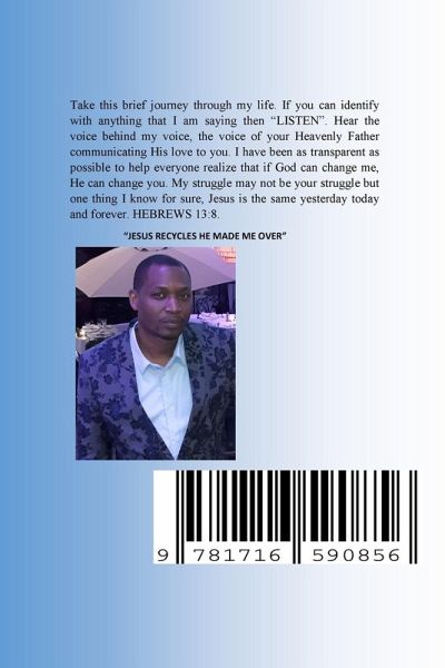 In Jesus Recycles He Made Me Over, Aaron Hawkins gives a transparent look into the life of a young man who struggled with self-esteem and self-worth issues since early childhood. Recycling is about picking up what has been thrown by the roadside or discarded as trash to clean it reshape it and give it new purpose. This book is an open and honest look at his journey to being recycled. It will make you laugh and cry and lead you to a positive uplifting ending. No matter what your history or background this book will impact your life and show you a glimpse of God that you may have never seen. If you have ever experienced any type of habit or addiction this book will open your eyes and guide your steps toward a life of freedom through Jesus Christ.