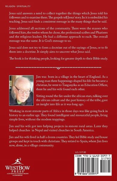 Jesus said answers a need to collect together the things which Jesus told his followers and to examine them. The gospels tell Jesus' story. In it is embedded his teaching. Jesus said finds a consistent message in the many things that he said. Jesus addressed all sections of the community. There were the masses who followed him, the twelve whom he chose, the professional scribes and Pharisees and the religious leaders. He had a different approach to each. The overall message was the same. It is God's message to us. Jesus said does not try to form a doctrine out of the sayings of Jesus, or to fit them into a doctrine. It simply aims to uncover what Jesus said. The book is for thinking people, looking for greater depth to their Bible study.