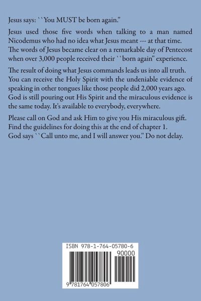Jesus Says: ``You Must Be Born Again.'' Jesus used those five words when talking to a man named Nicodemus who had no idea what Jesus meant --- at that time. The words of Jesus became clear on a remarkable day of Pentecost when over 3,000 people received their ``born again'' experience. The result of doing what Jesus commands leads us into all truth. You can receive the Holy Spirit with the undeniable evidence of speaking in other tongues like those people did 2,000 years ago. God is still pouring out His Spirit and the miraculous evidence is the same today. It's available to everybody, everywhere. Please call on God and ask Him to give you His miraculous gift. Find the guidelines for doing this at the end of chapter 1. God says ``Call unto me, and I will answer you.'' Do not delay.