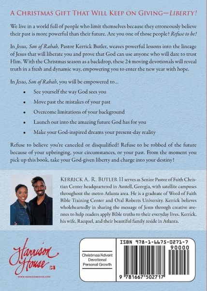 A Christmas Gift That Will Keep on Giving-Liberty! We live in a world full of people who limit themselves because they erroneously believe their past is more powerful than their future. Are you one of those people? Refuse to be! In Jesus, Son of Rahab, Pastor Kerrick Butler, weaves powerful lessons into the lineage of Jesus that will liberate you and prove that God can use anyone who will dare to trust Him. With the Christmas season as a backdrop, these 24 moving devotionals will reveal truth in a fresh and dynamic way, empowering you to enter the new year with hope. In Jesus, Son of Rahab, you will be empowered to... See yourself the way God sees you Move past the mistakes of your past Overcome limitations of your background Launch out into the amazing future God has for you Make your God-inspired dreams your present-day reality Refuse to believe you're canceled or disqualified! Refuse to be robbed of the future because of your upbringing, your circumstances, or your past. From the moment you pick up this book, take your God-given liberty and charge into your destiny!