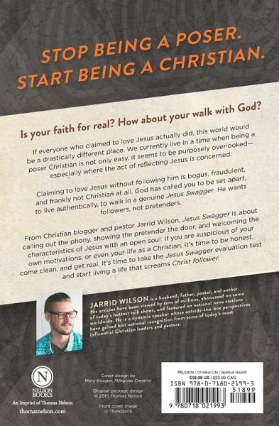 Stop being a poser. Start being a Christian. Is your faith for real? How about your walk? If everyone who claimed to love Jesus actually did, this world would be pretty close to paradise. Yet we live in a time when being a poser is not only easy, it's rewarded--especially where Jesus is concerned. But claiming to love Jesus without following him is bogus, fraudulent, and--frankly--it's not you. God has called you to be set apart, to live authentically, to walk a genuine Jesus Swagger. He wants followers, not pretenders. From Christian blogger Jarrid Wilson, Jesus Swagger is about calling out the phony, showing the pretender the door, and letting Jesus in instead. If you are suspicious of your own motivations, your own talk, or even your own Christianity, it's time to be honest, come clean, and get real. It's time to take the Jesus Swagger litmus test and start walking the walk.