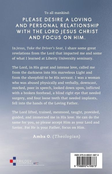 To all mankind: PLEASE DESIRE A LOVING AND PERSONAL RELATIONSHIP WITH THE LORD JESUS CHRIST AND FOCUS ON HIM. In Jesus, Take the Driver's Seat, I share some great revelations from the Lord that impacted me and some of what I learned at Liberty University seminary. The Lord, in His great and intense love, called me from the darkness into His marvelous Light and from the sheepfold to be His servant. I was a woman who was abused physically and verbally, downcast, mocked, poor in speech, looked down upon, inflicted with a broken forehead, a blind right eye that needed surgery, and four loose teeth that needed implants, fell into the hands of the Loving Father. The Lord lifted, trained, mentored, taught, provided, guided, and immersed me in His love. He can do the same for you, so please accept Him as your Lord and Savior. For He is your Father, focus on Him. A mba O. (Theologian)