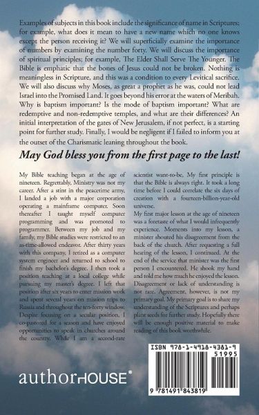 Examples of subjects in this book include the significance of name in Scriptures; for example, what does it mean to have a new name which no one knows except the person receiving it? We will superficially examine the importance of numbers by examining the number forty. We will discuss the importance of spiritual principles; for example, The Elder Shall Serve The Younger. The Bible is emphatic that the bones of Jesus could not be broken. Nothing is meaningless in Scripture, and this was a condition to every Levitical sacrifice. We will also discuss why Moses, as great a prophet as he was, could not lead Israel into the Promised Land. It goes beyond his error at the waters of Meribah. Why is baptism important? Is the mode of baptism important? What are redemptive and non-redemptive temples, and what are their differences? An initial interpretation of the gates of New Jerusalem, if not perfect, is a starting point for further study. Finally, I would be negligent if I failed to inform you at the outset of the Charismatic leaning throughout the book. May God bless you from the first page to the last! Bill Moore