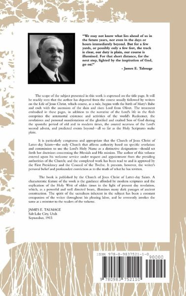 It is particularly congruous and appropriate that the Church of Jesus Christ of Latter-day Saints-the only Church that affirms authority based on specific revelation and commission to use the Lord's Holy Name as a distinctive designation-should set forth her doctrines concerning the Messiah and His mission. The author of this volume entered upon his welcome service under request and appointment from the presiding authorities of the Church; and the completed work has been read to and is approved by the First Presidency and the Council of the Twelve. It presents, however, the writer's personal belief and profoundest conviction as to the truth of what he has written. A characteristic feature of the work is the guidance afforded by modern scriptures and the explication of the Holy Writ of olden times in the light of present day revelation, which, as a powerful and well directed beam, illumines many dark passages of ancient construction. James E. Talmage Salt Lake City, Utah September, 1915