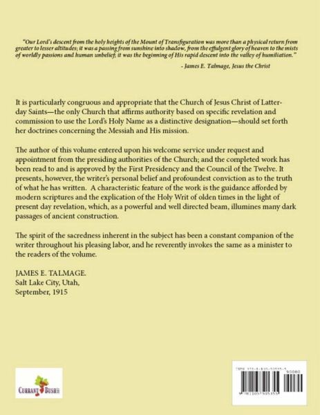 It is particularly congruous and appropriate that the Church of Jesus Christ of Latter-day Saints-the only Church that affirms authority based on specific revelation and commission to use the Lord's Holy Name as a distinctive designation-should set forth her doctrines concerning the Messiah and His mission. The author of this volume entered upon his welcome service under request and appointment from the presiding authorities of the Church; and the completed work has been read to and is approved by the First Presidency and the Council of the Twelve. It presents, however, the writer's personal belief and profoundest conviction as to the truth of what he has written. A characteristic feature of the work is the guidance afforded by modern scriptures and the explication of the Holy Writ of olden times in the light of present day revelation, which, as a powerful and well directed beam, illumines many dark passages of ancient construction. JAMES E. TALMAGE. Salt Lake City, Utah, September, 1915