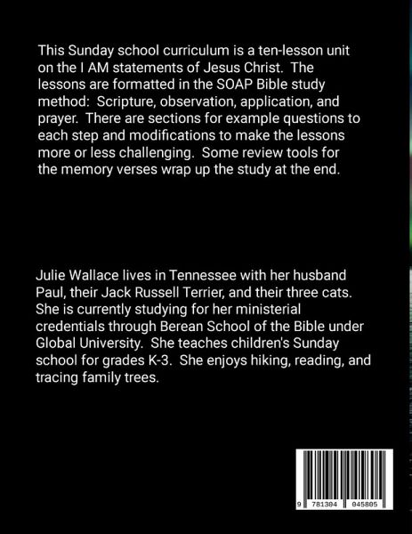This is a Sunday school curriculum unit of ten lessons based on the I AM statements of Jesus Christ. The study uses the SOAP method of Bible study: Scripture, observation, application, and prayer. Included in the unit are modifications to make lessons more or less challenging, example questions for each step to tailor lessons for each class, and suggestions for snacks, arts & crafts, activities, and songs.